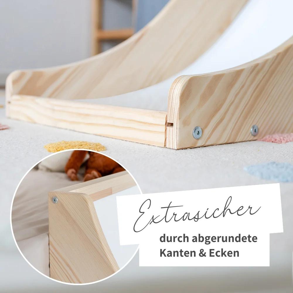 Mit ihren stabilen und hohen Seitenteilen bietet die Rutsche fĂŒrs IKEA Hochbett höchste Sicherheit. So kann dein Kind sorgenfrei hinuntersausen, wĂ€hrend die rund geschliffenen HandlĂ€ufe zusĂ€tzlichen Schutz bieten und das Abrutschen verhindern. Die Rutsche besteht aus hochwertigem Kiefernholz, das perfekt mit dem Look des Kura Betts harmoniert.Â