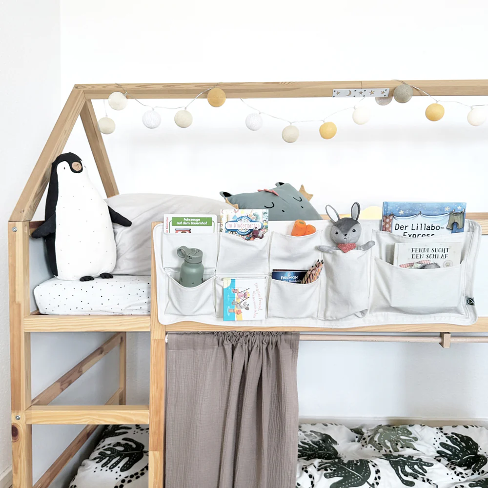 Die Betttasche wurde speziell fĂŒr das IKEA Kura Bett entworfen und passt sich perfekt an dessen MaĂe und Design an. Mit insgesamt 9 unterschiedlich groĂen FĂ€chern bietet sie genug Platz fĂŒr die kleinen Alltagshelfer deines Kindes. So bleibt das Lieblingsbuch immer in Reichweite und das Lieblingskuscheltier findet ĂŒber Nacht ein sicheres PlĂ€tzchen.
