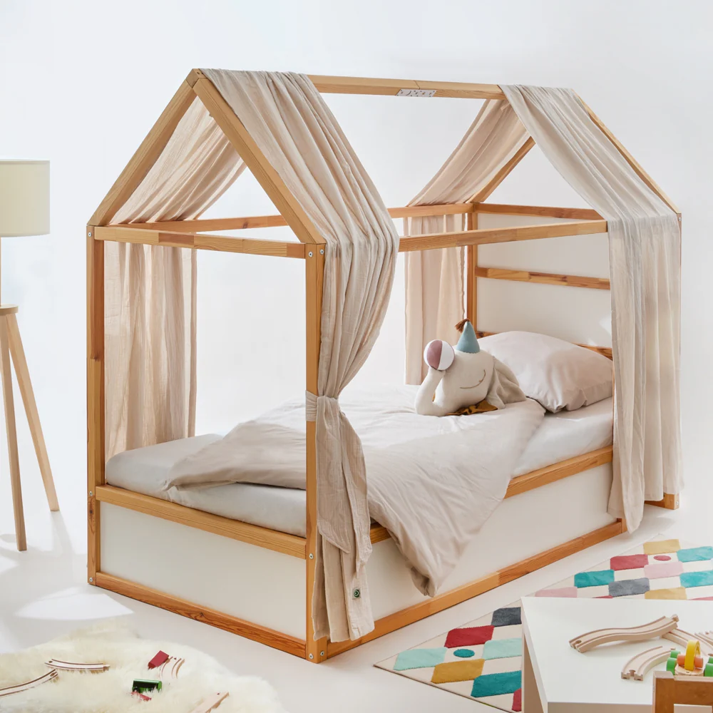 Mit unserem Baldachin verwandelst du das beliebte IKEA Kura Kinderbett in eine fantasievolle RĂŒckzugs- und Kuschelecke. Der Betthimmel ist exakt auf unser Kura Hausdach abgestimmt und lĂ€sst sich ganz einfach mithilfe angenĂ€hter BĂ€nder an den Pfosten fixieren. So entsteht im Nu ein behaglicher WohlfĂŒhlort im Kinderzimmer.