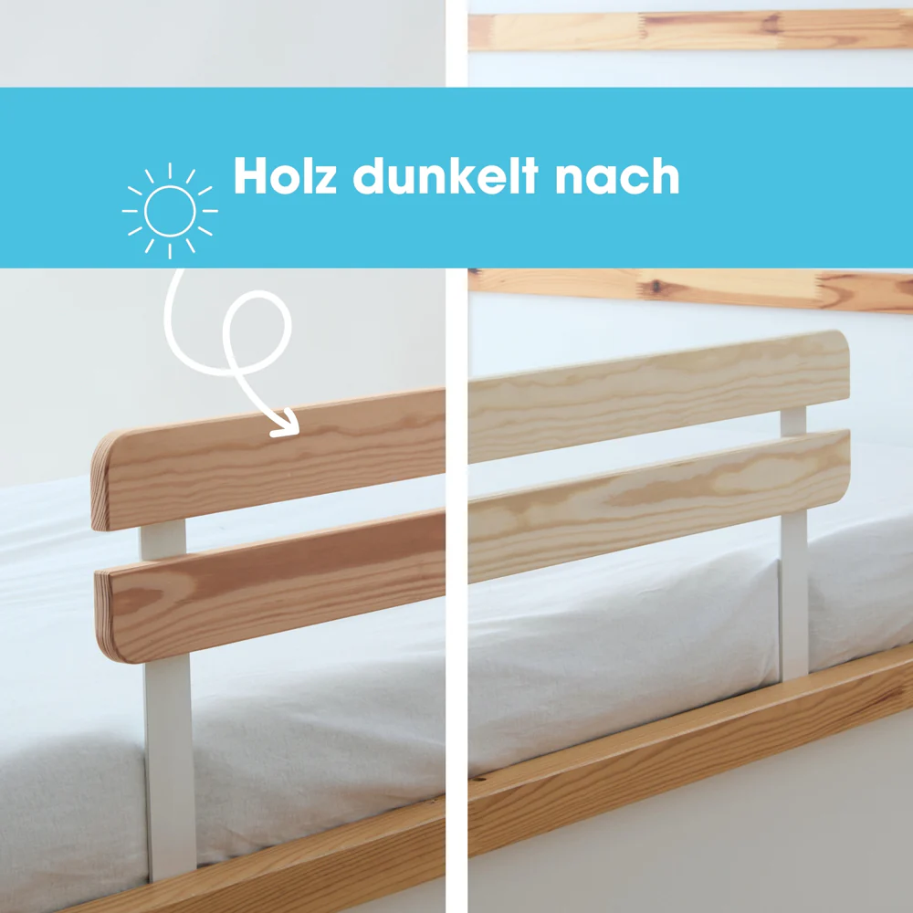 Hinweis: Das naturbelassene Holz ist anfangs sehr hell, dunkelt jedoch mit der Zeit nach und gleicht sich dabei dem Farbton des Kura Bettes an.