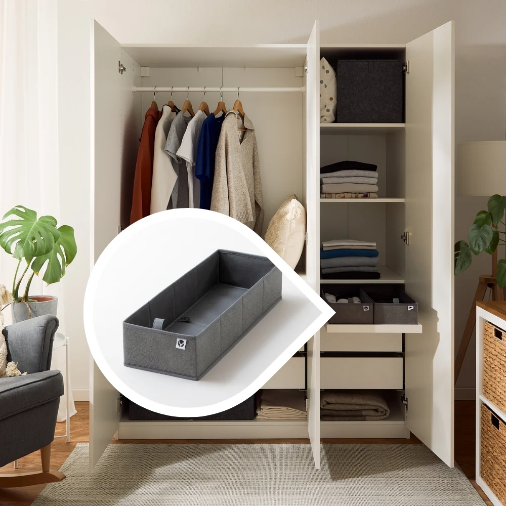 Die Schubladen im Pax Kleiderschrank tragen den Namen Komplement. Unsere Organizer sind daher speziell für die 100 cm breiten Komplement-Schubladen mit 58 cm Tiefe konzipiert. Wichtig zu wissen: Die 100 cm beziehen sich auf die äußere Blende, das Innenmaß ist etwas kleiner. Genau hier setzt unser 4er-Set an – es nutzt die komplette Innenbreite optimal aus, ohne wertvollen Stauraum zu verschenken. Zwischen Blende und Organizer bleibt bewusst ein kleiner Abstand, sodass du die Boxen auch gefüllt jederzeit bequem herausnehmen kannst.