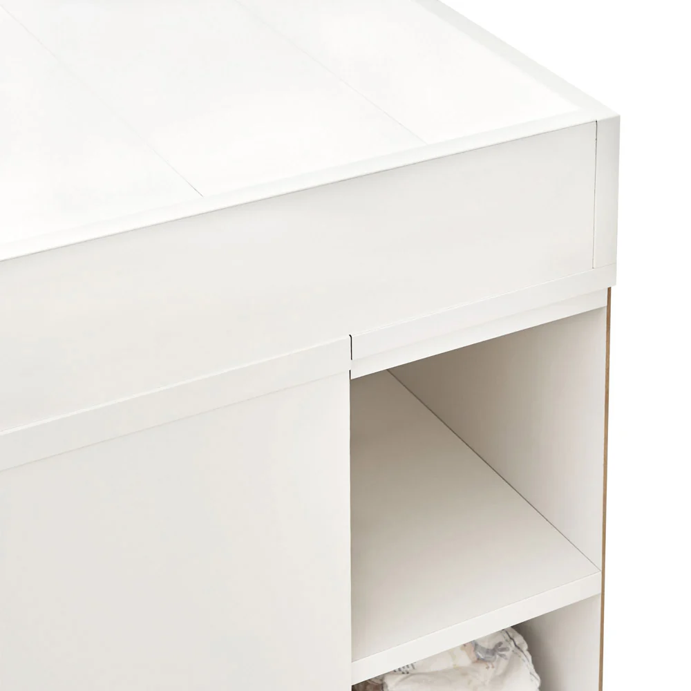 Gerade beim Wickeln zählt jeder Handgriff. Unser Set bietet dir nicht nur eine stabile und sichere Wickelfläche, sondern auch praktischen Stauraum genau dort, wo du ihn brauchst. Das offene Regal nutzt nach Montage des Wickelaufsatzes den Platz hinter der Kommode optimal aus und sorgt dafür, dass Windeln, Feuchttücher, Cremes und Wechselkleidung immer griffbereit sind.